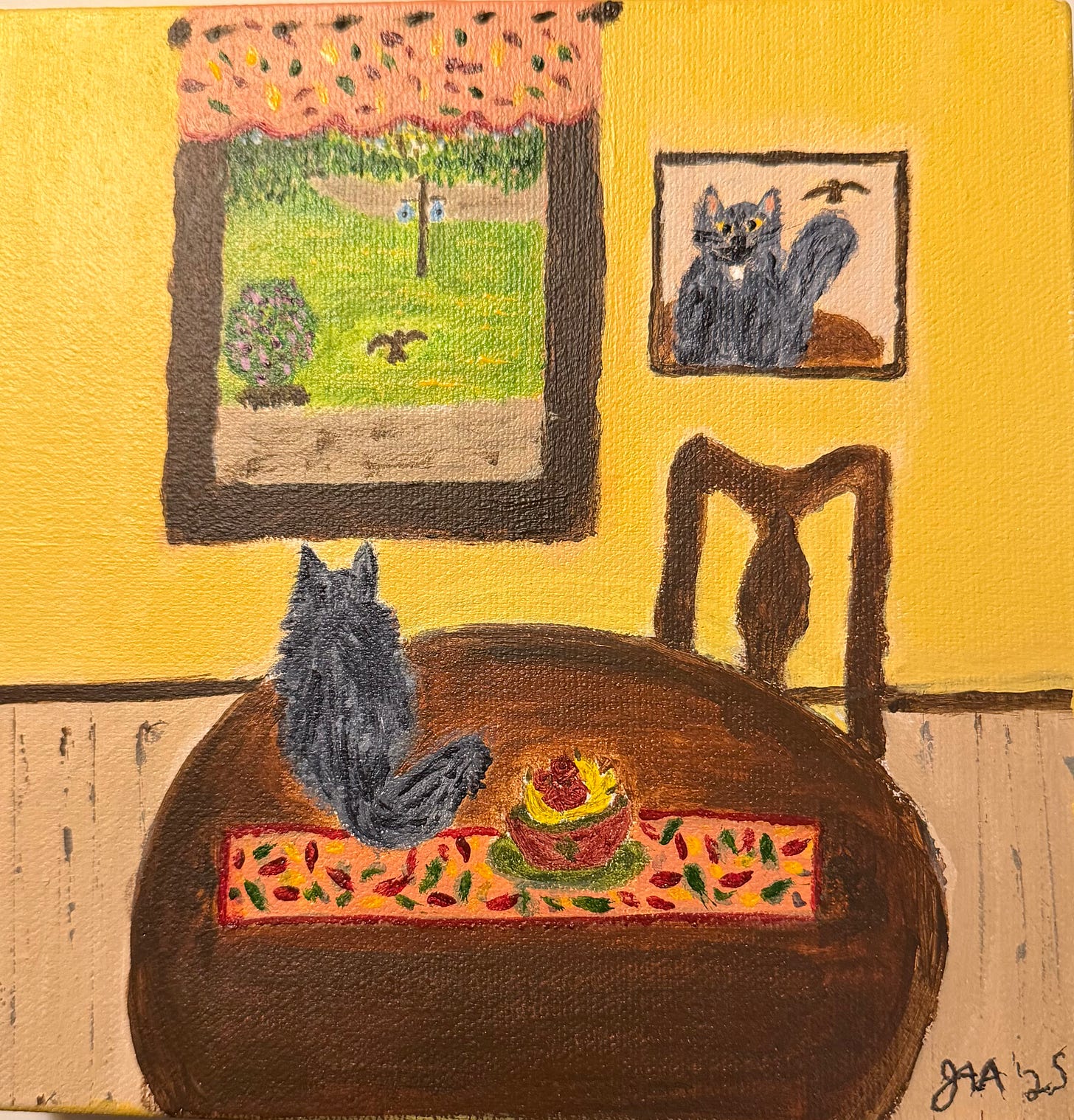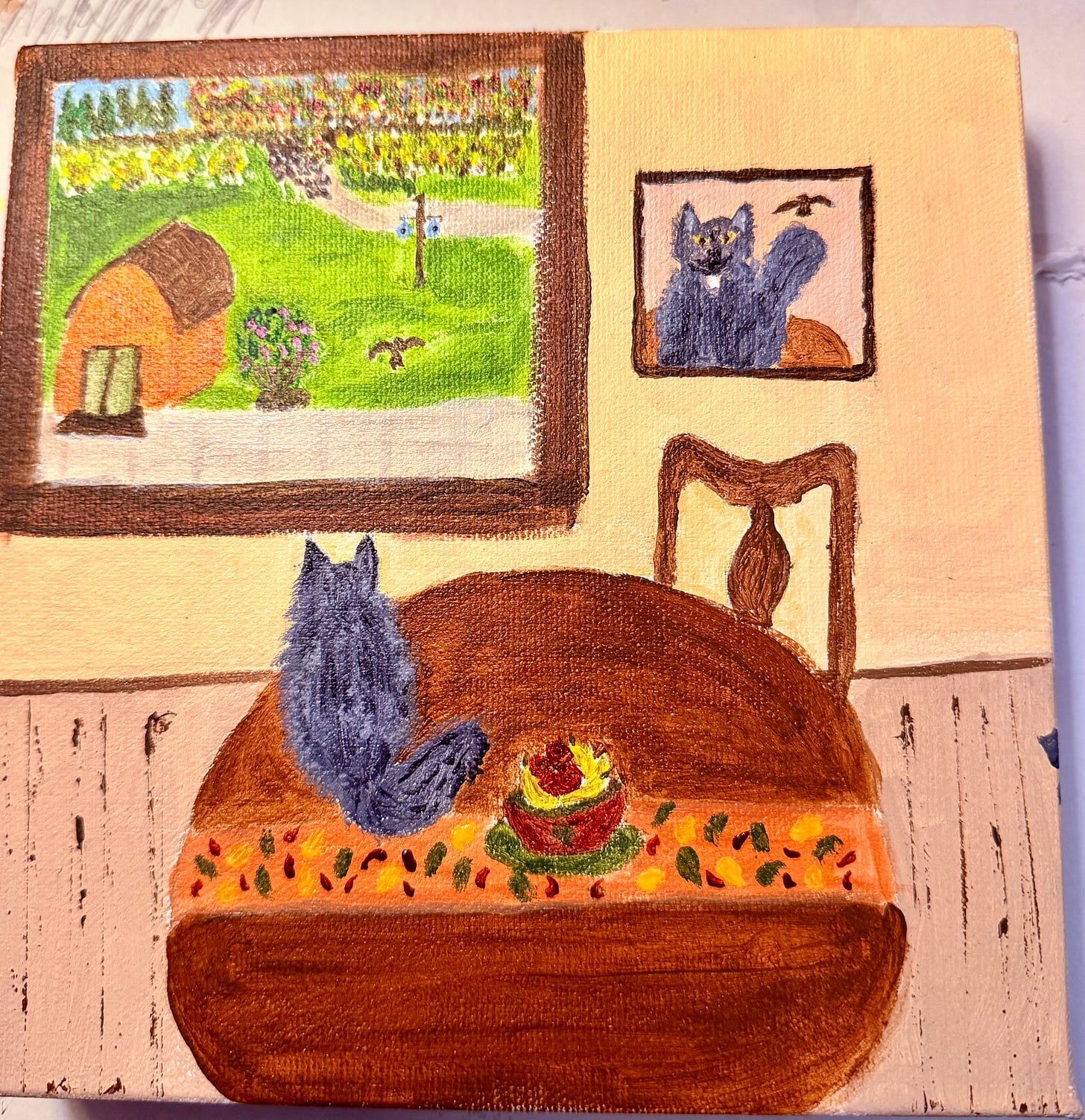 In my October newsletter, I shared what was at that time a work in progress. I struggled with the original version of my acrylic on 8x8x1.5 canvas, which I named Kalei and Her Feathered Friend and with each change, I never felt that it was completed. I even repainted another version of it in my art journal and while I liked it, I wasn’t convinced, I should change the view looking through the window. My drawing teacher, Michele, suggested the changes I used in the art journal version which totally changed the view from the window including adding curtains. As a compromise, I did cut down the window size but instead, I only removed the shed, enlarged the Rose of Sharon bush and added a valance curtain. After adding some additional detail, I knew it was finished. Like Pierre Bonnard, I’ve always had a difficult time knowing when a painting is finished, but this time I was sure.